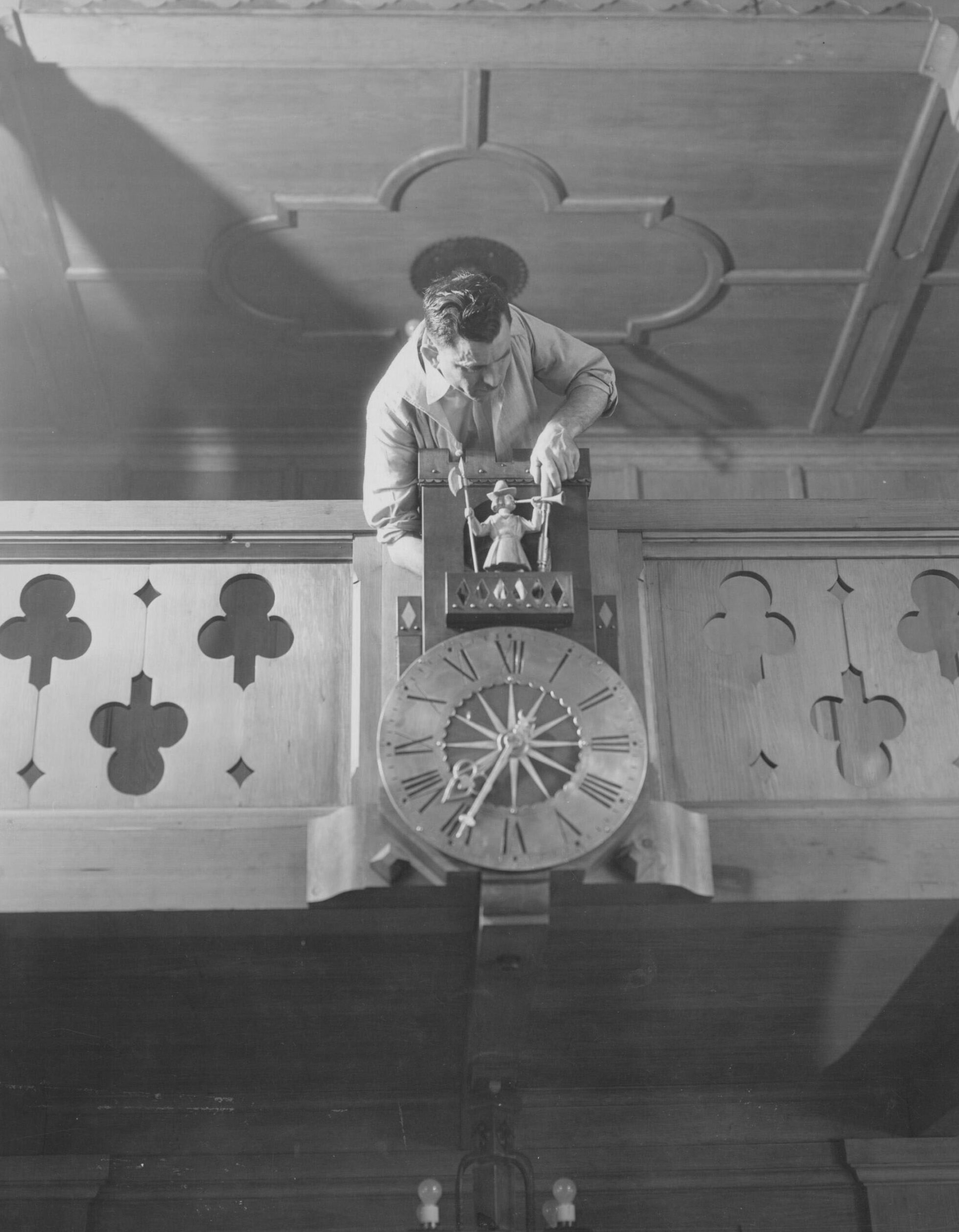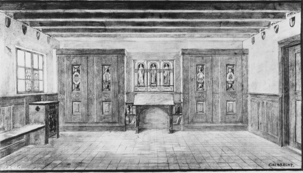 While Waelderhaus was being built, Kaspar created carvings, woodcuts, reliefs, and iron and pewter work that enhance the building to this day. He also personally designed and supervised all aspects of décor, from maps and tapestries to curtains and rods. When Waelderhaus was officially dedicated on Sunday, July 26, 1931, Kaspar took to the stage and described the uniquely Alpine home in this manner: