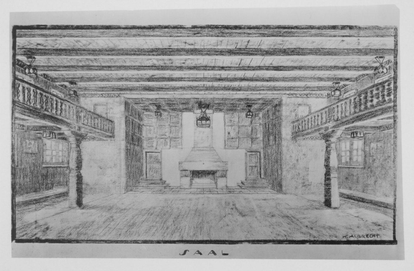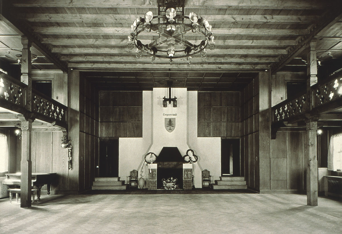 Inside, in the Saal or auditorium, the Bregenzerwald emblem of a pine tree appeared over the fireplace and included a wrought iron chandelier.