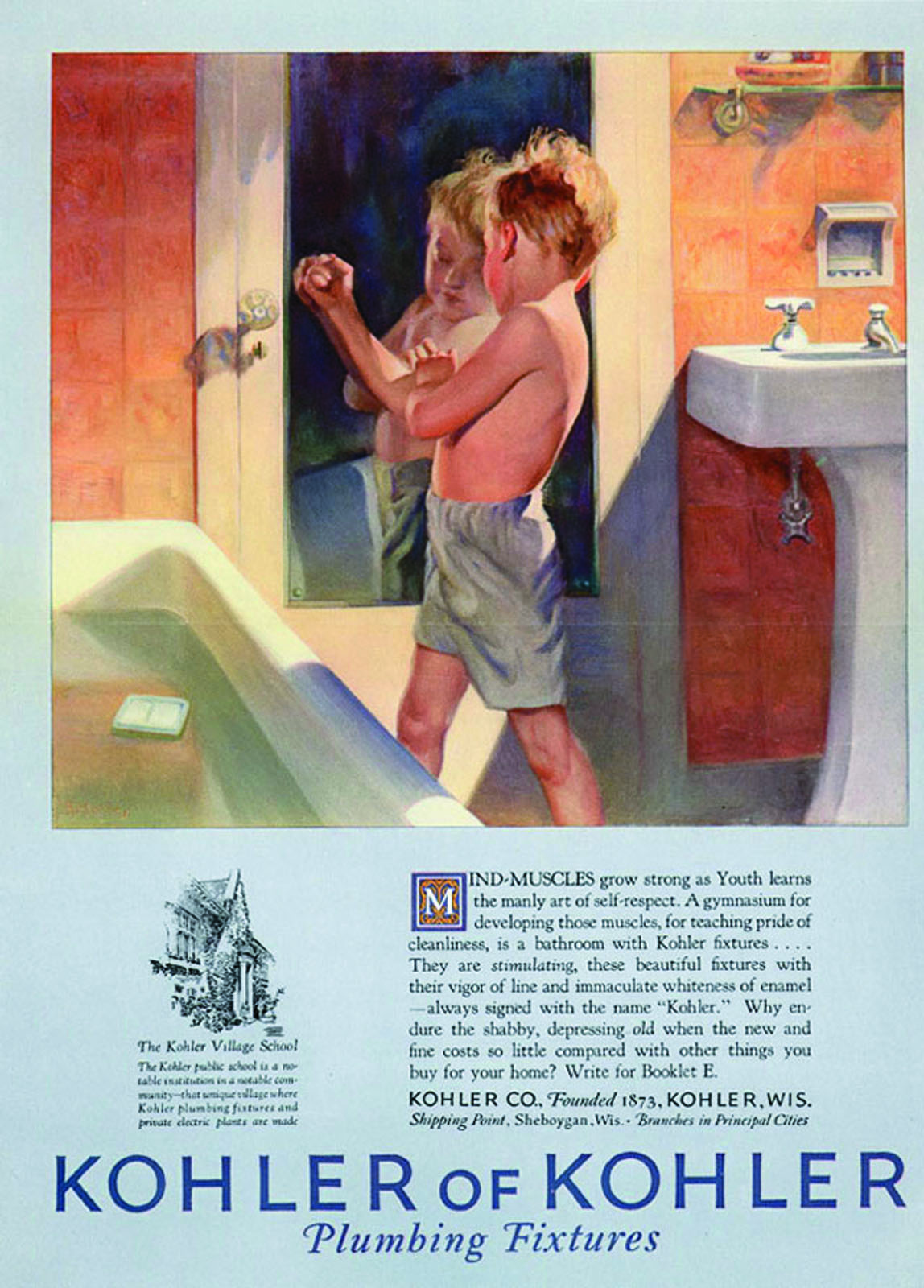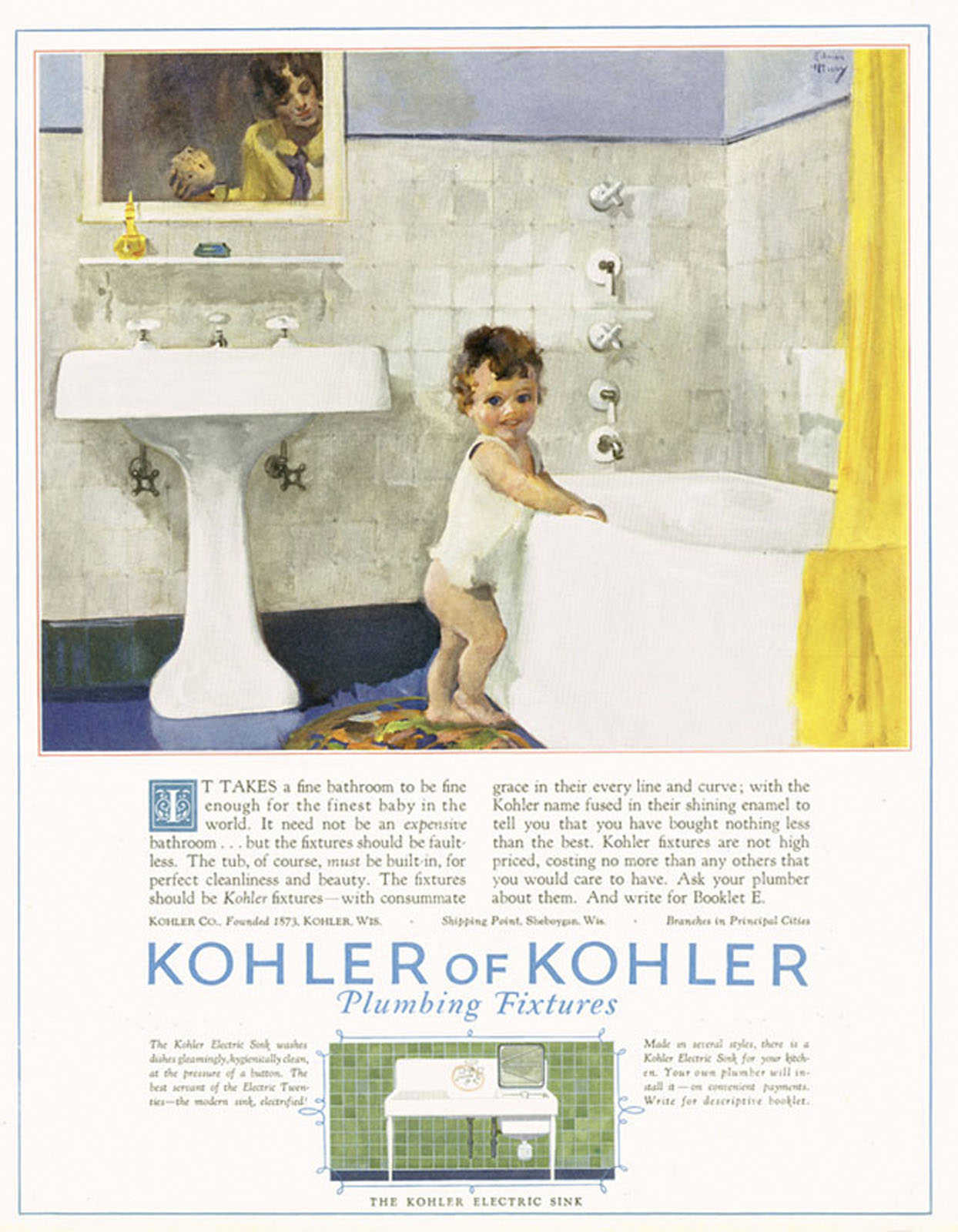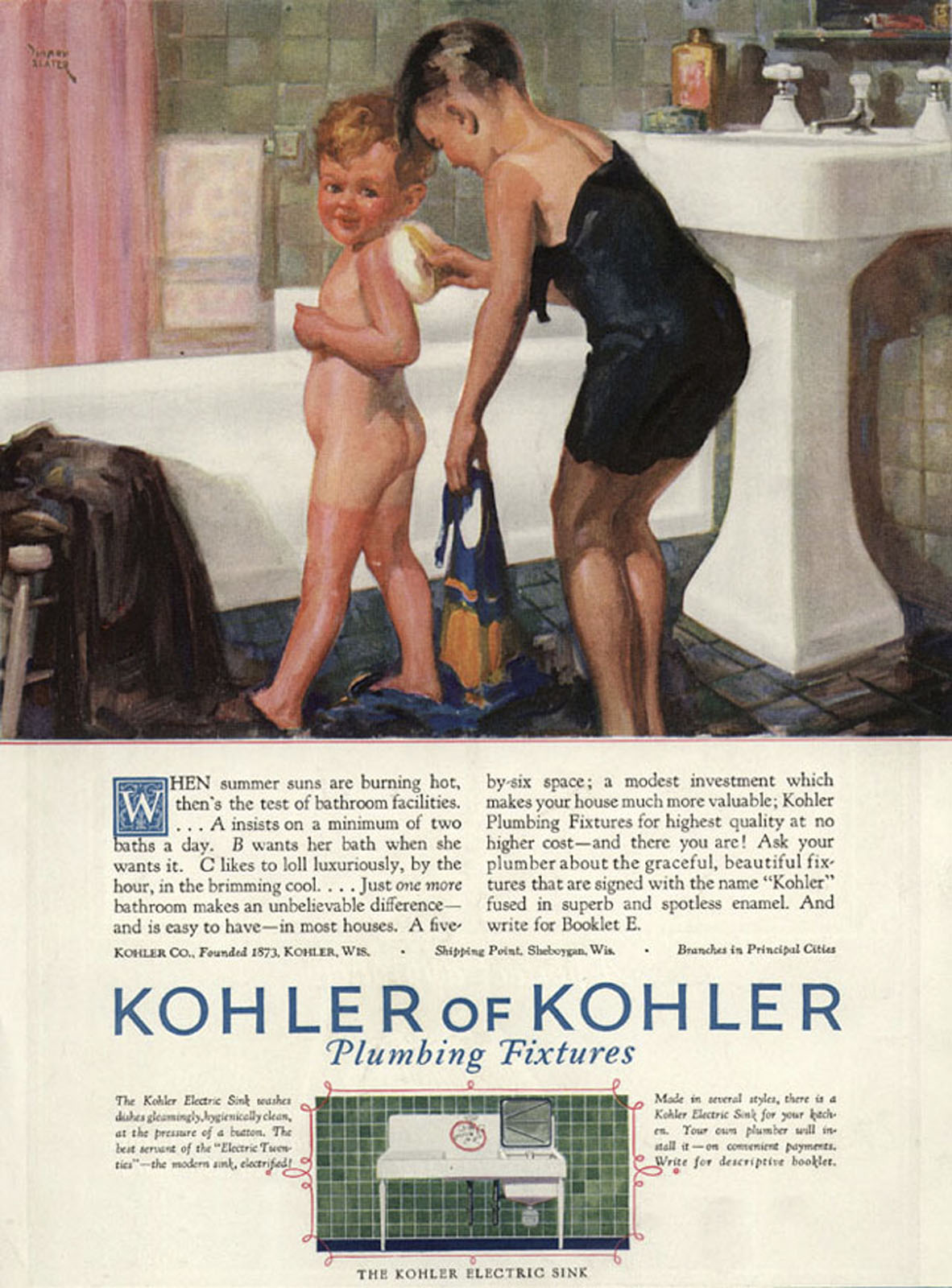 KOHLER has forged a celebrated legacy of producing artistic, avant-garde advertising that has elevated the brand to aspirational status among consumers. A century ago, the company launched an ambitious advertising campaign, spanning 1925-32, when it commissioned several artists – R.H. Collins, Harry Slater, Elmor Brown, and Arthur Covey – to create one-of-a-kind oil paintings that depicted KOHLER products in everyday use.