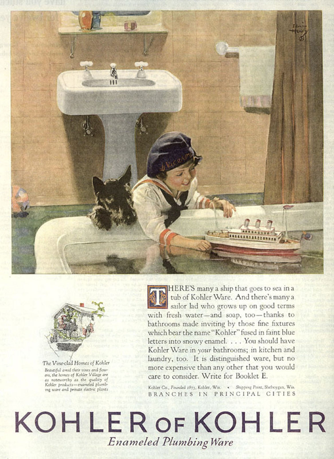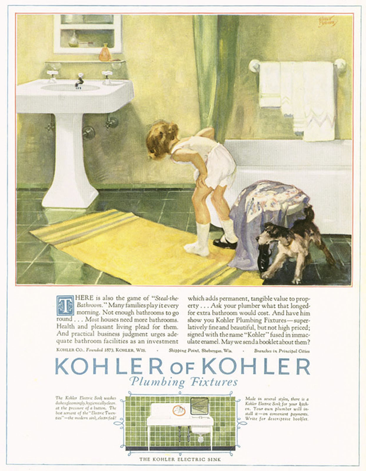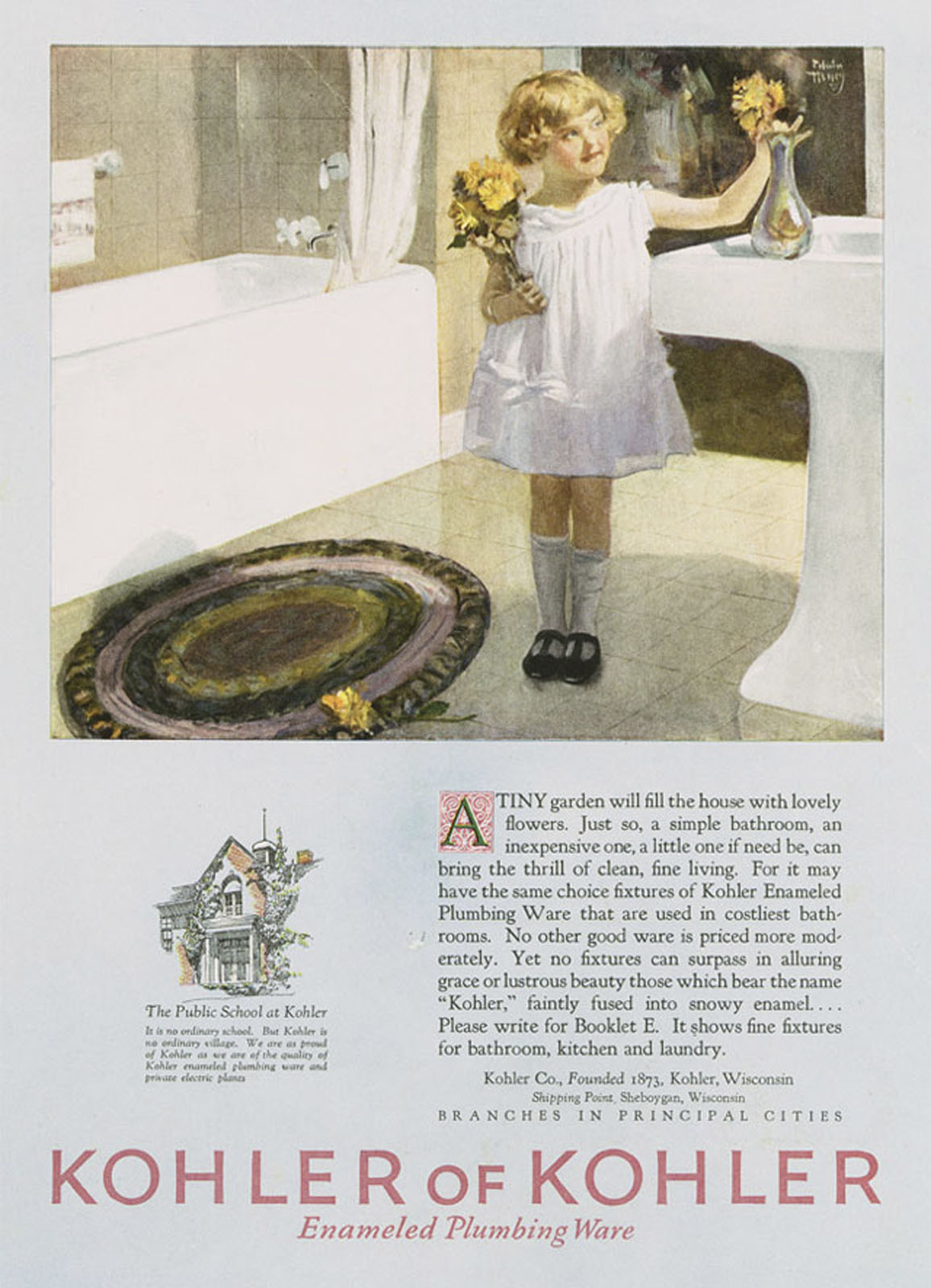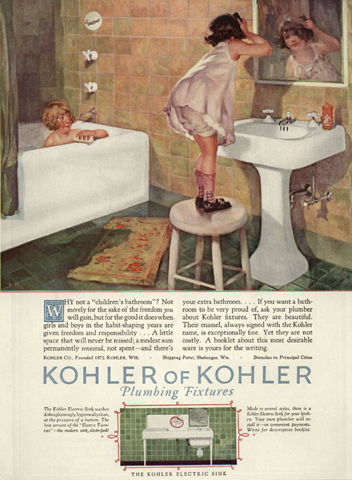KOHLER has forged a celebrated legacy of producing artistic, avant-garde advertising that has elevated the brand to aspirational status among consumers. A century ago, the company launched an ambitious advertising campaign, spanning 1925-32, when it commissioned several artists – R.H. Collins, Harry Slater, Elmor Brown, and Arthur Covey – to create one-of-a-kind oil paintings that depicted KOHLER products in everyday use.